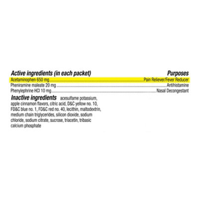 Use 8 ounces of hot water or heat up 8 ounces cold water and stir in one packet of. Pheniramine-phenyleph-acetamin This combination medication is used to temporarily treat symptoms caused by the common cold flu allergies.